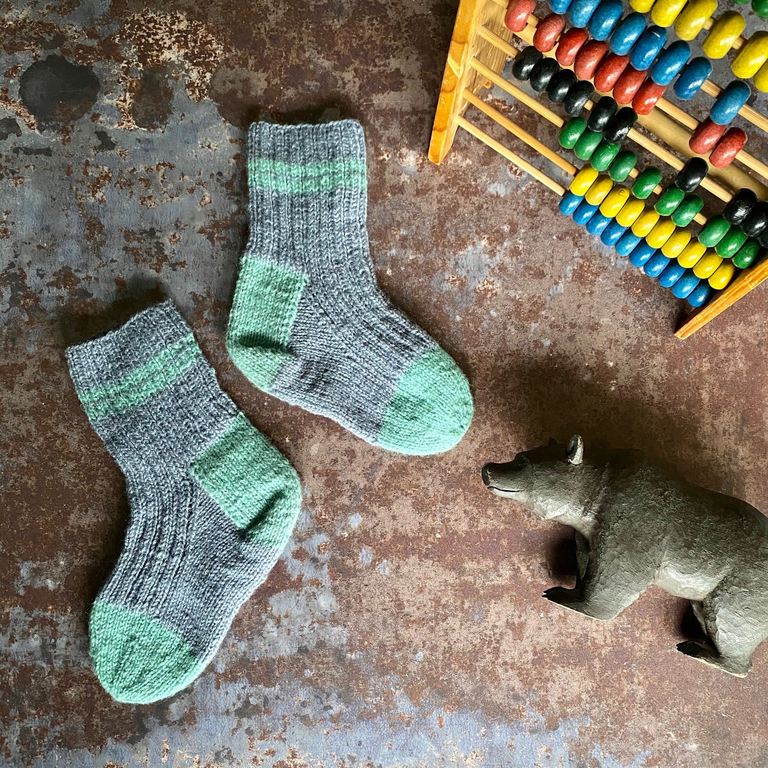 Dette er en kopi av et par barnesokker som ble fotografert på en liten gutt i Meløy, nord for Rana mot Svartisen, mellom 1920 og 1930. Sokkene er ribbestrikket i to farger og har smale striper på skaftet.