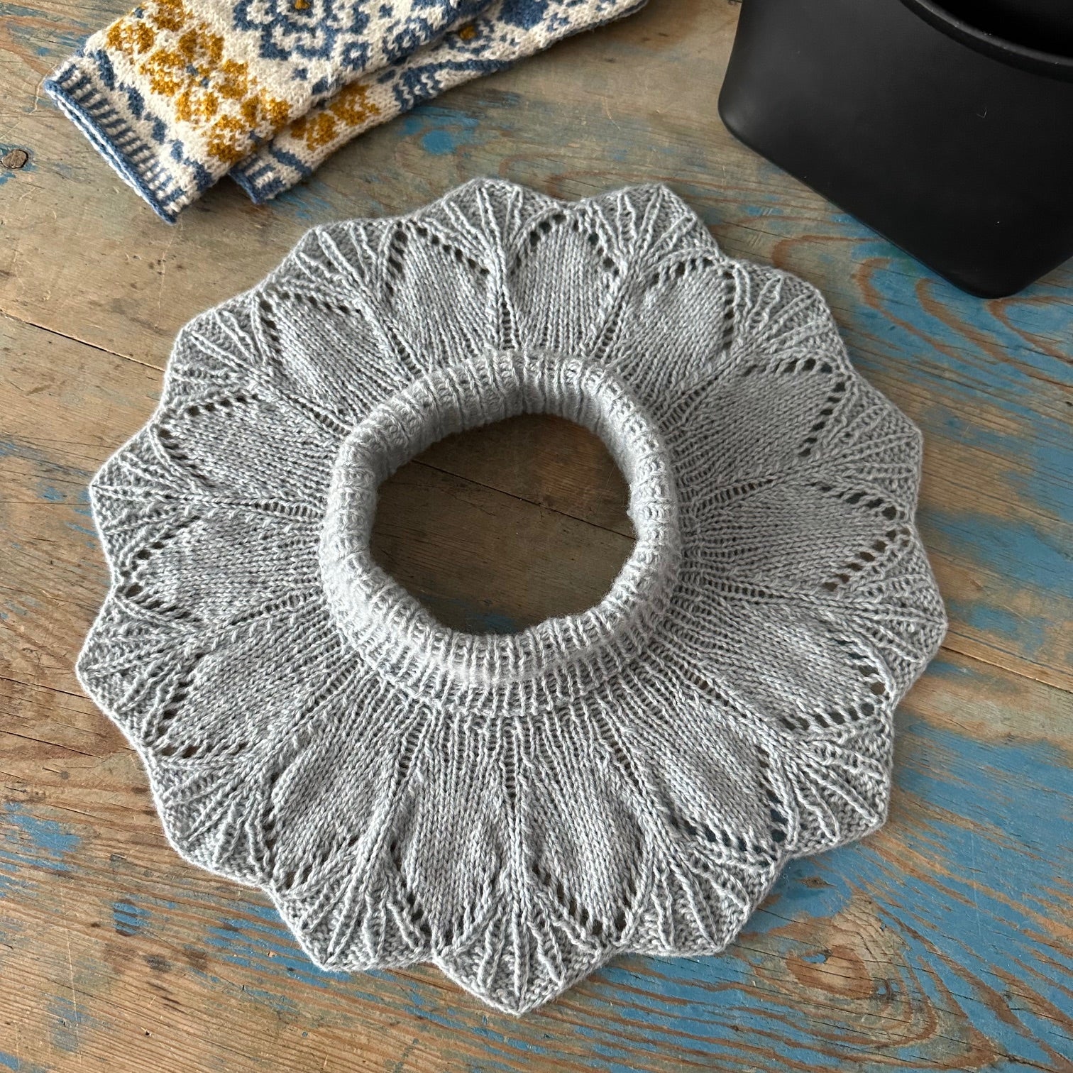 Når kulda biter er det ikke noe som er deiligere enn en varm halskrave. Denne er strikket i mykt deilig ullgarn og passer de fleste. Og så har den en søt blondekant rundt.
