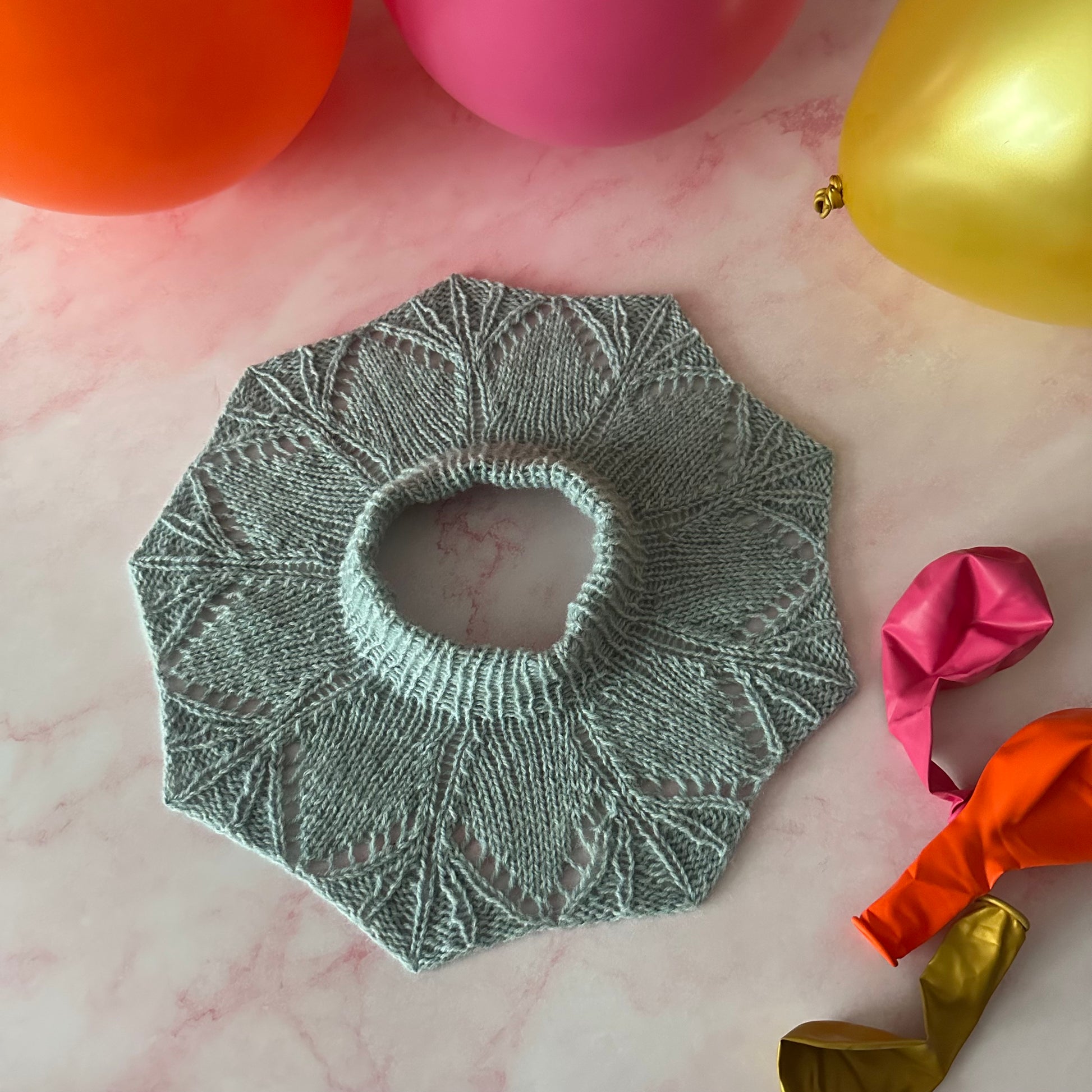 Halskraven strikkes rundt fra blondekanten og opp. Blondepartiet danner en dekorativ bølgekant som blir penest etter blokking.
