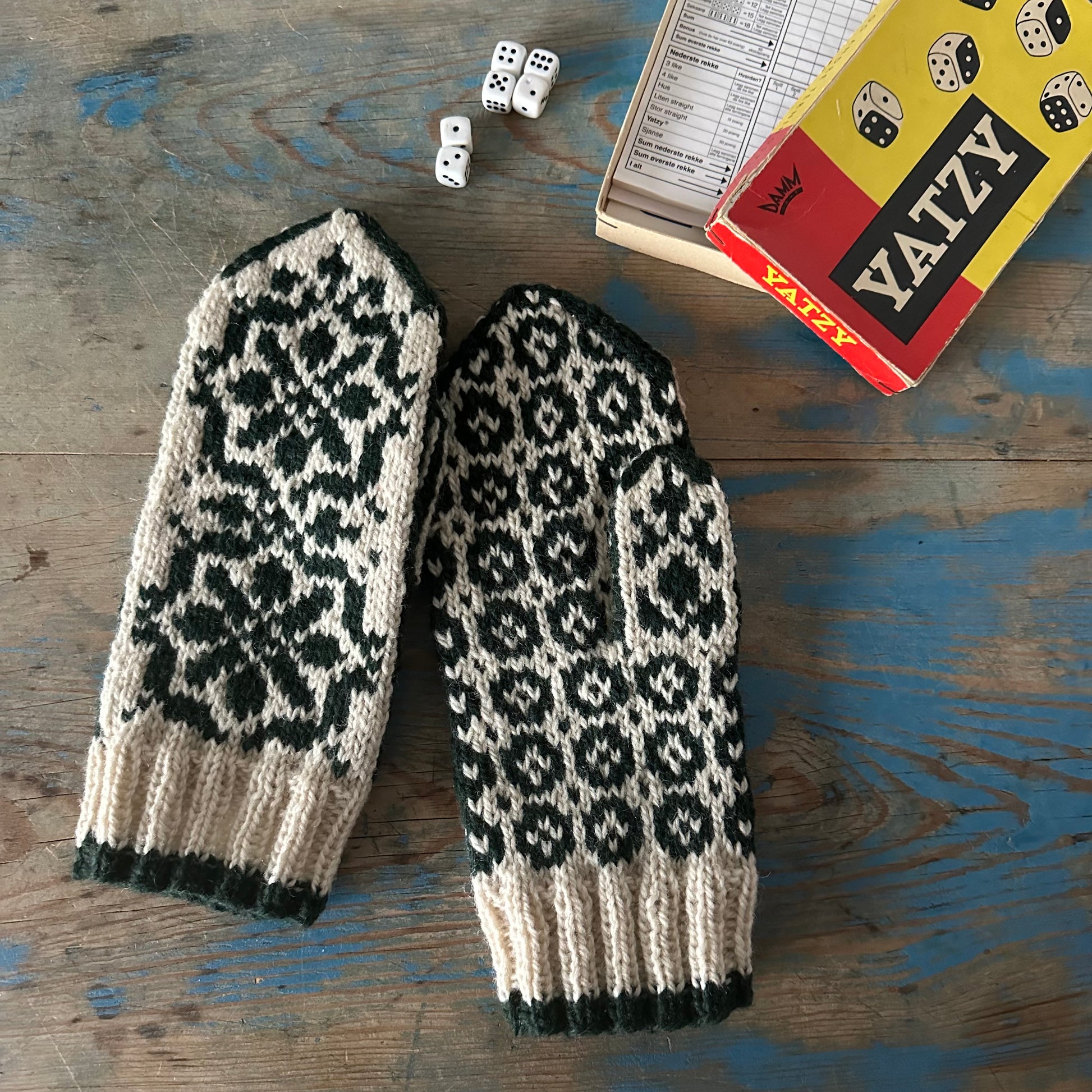 Disse vottene strikkes med tykt garn og tykke pinner, og tommelen har ikke kile. Derfor er vottene både enkle og raske å strikke.