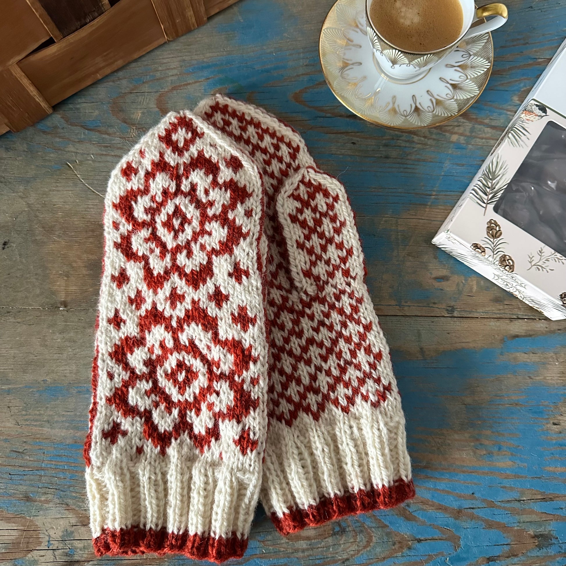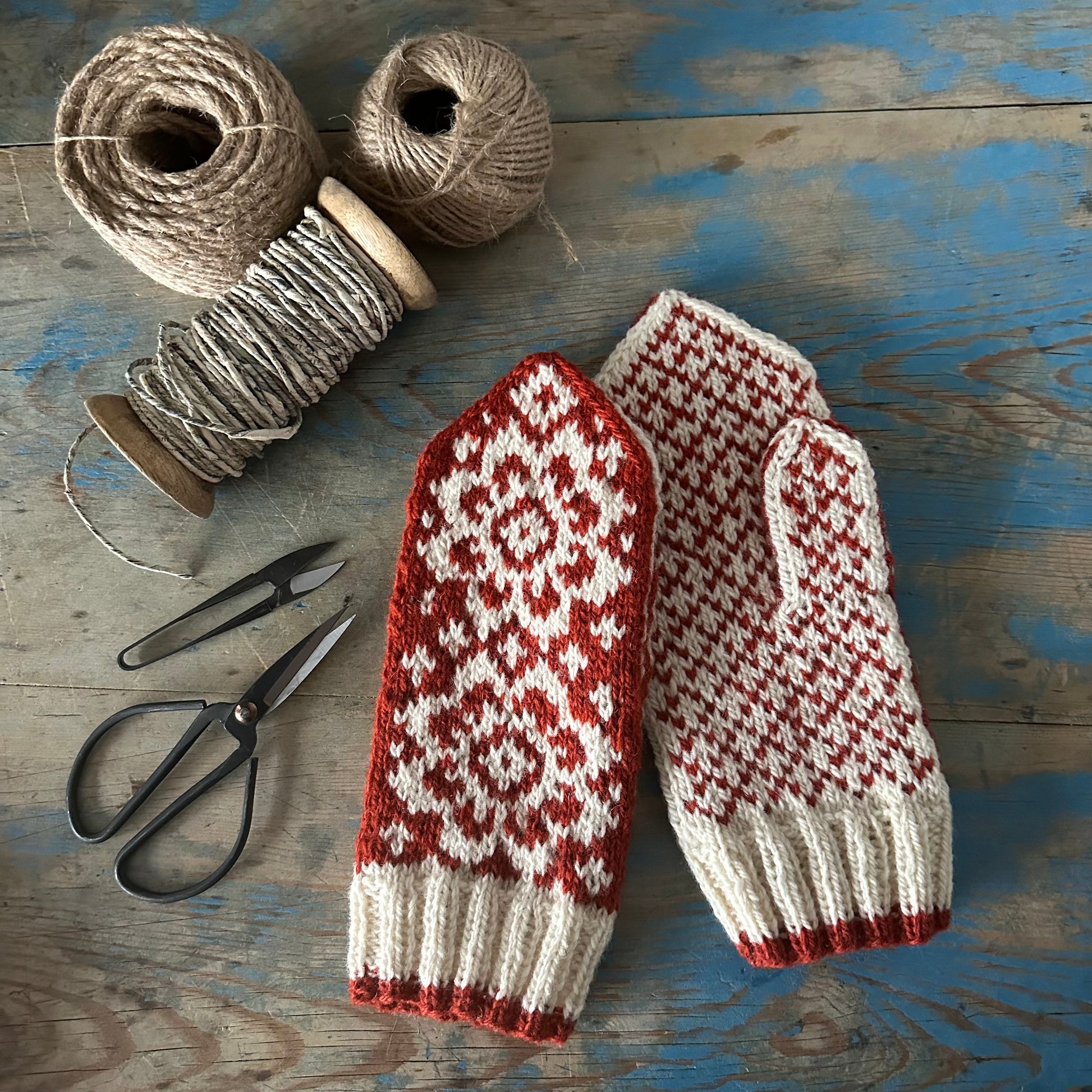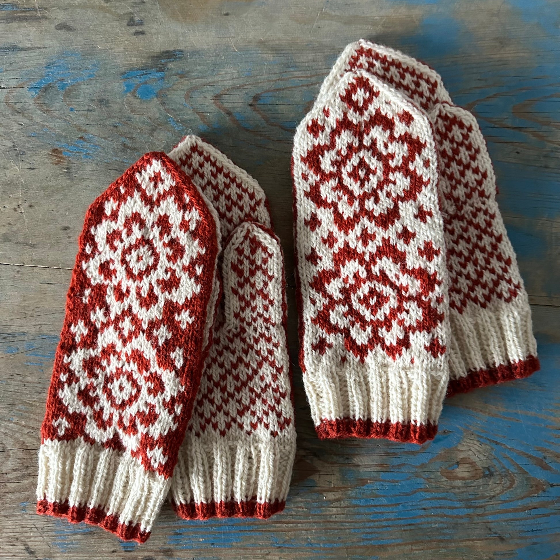 Disse vottene strikkes med tykt garn og tykke pinner, og tommelen har ikke kile. Derfor er vottene både enkle og raske å strikke.