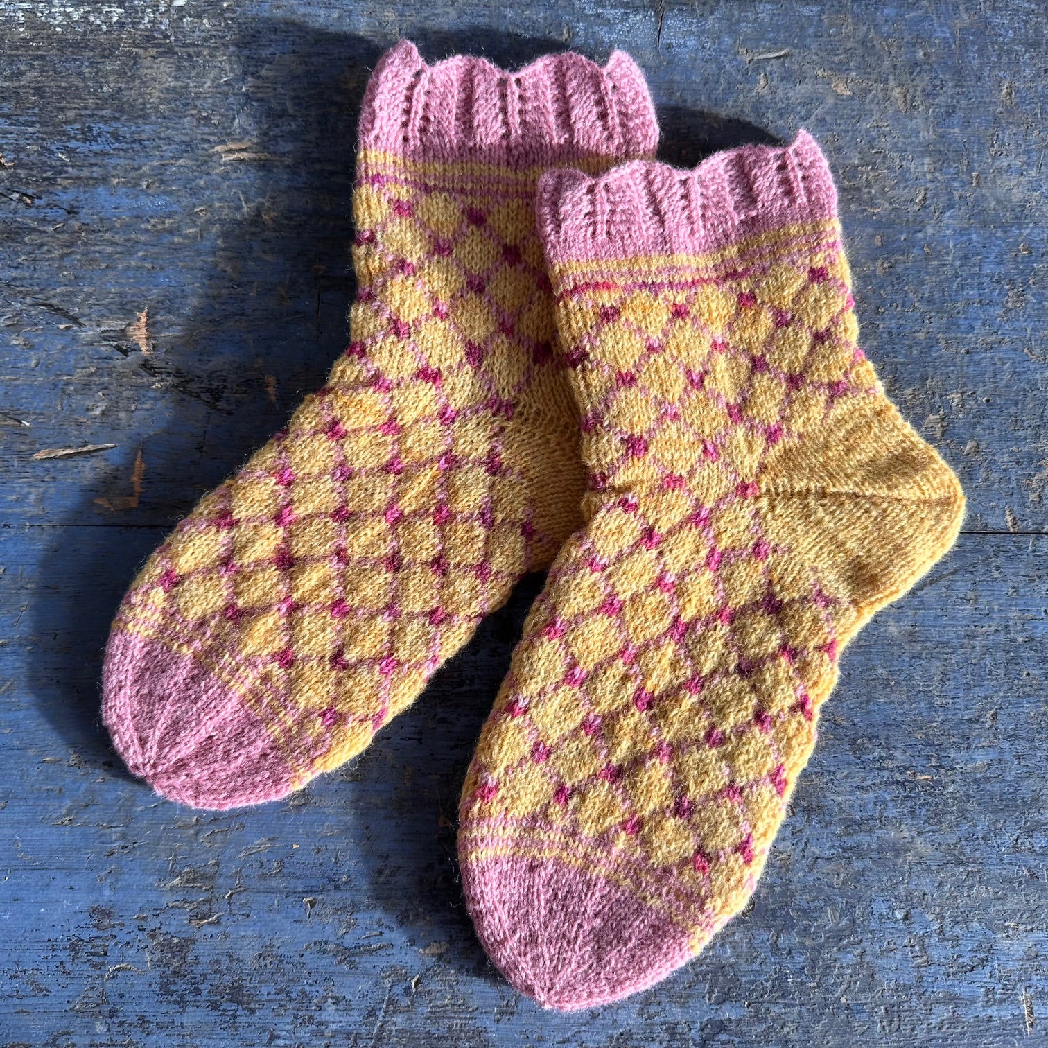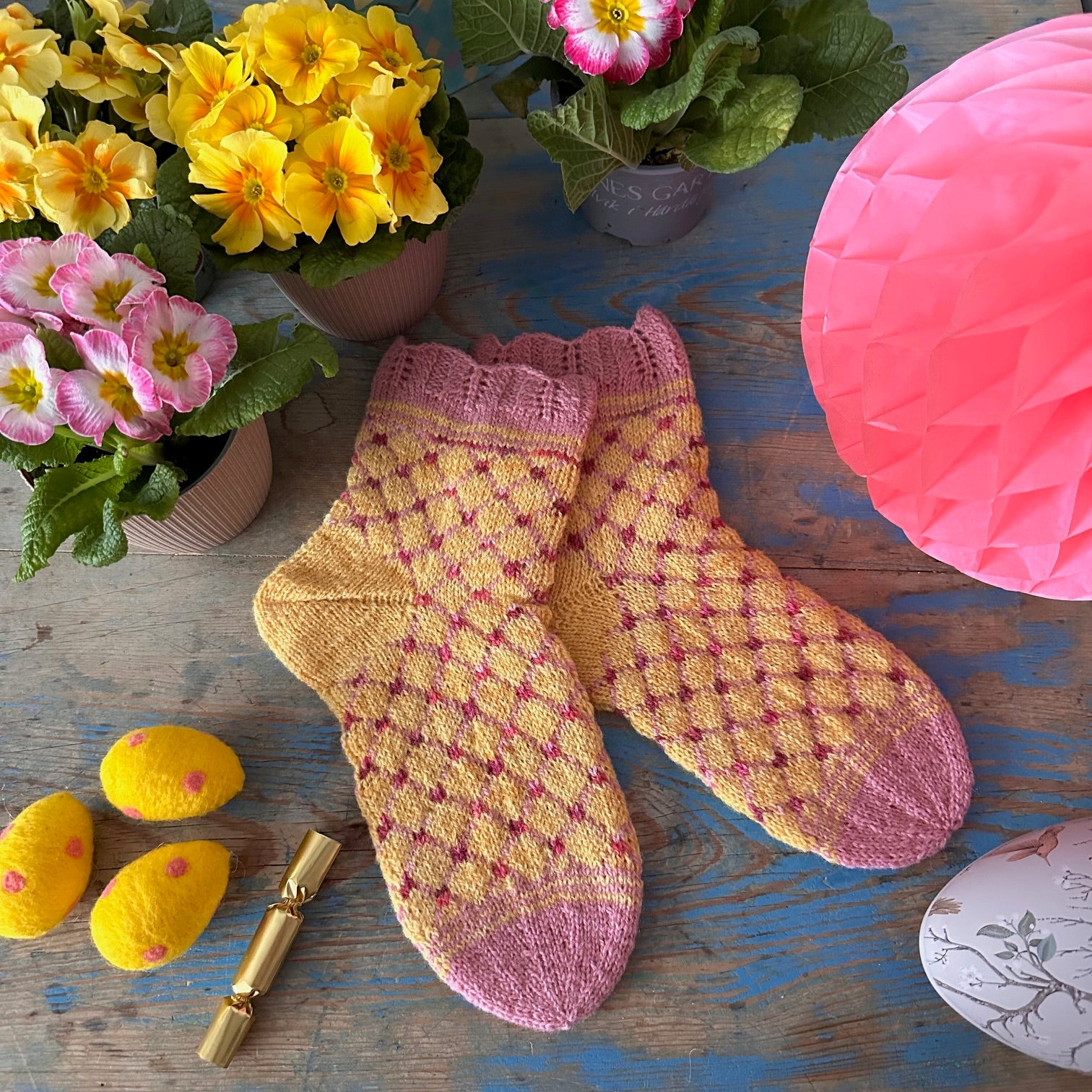 Primula er et par lune sokker i en varm gulfarge med rosa gittermønster og blondekant. De strikkes i hovedsak i et tynt, slitesterkt sokkegarn med nylonforsterkning, uten superwashbehandling.