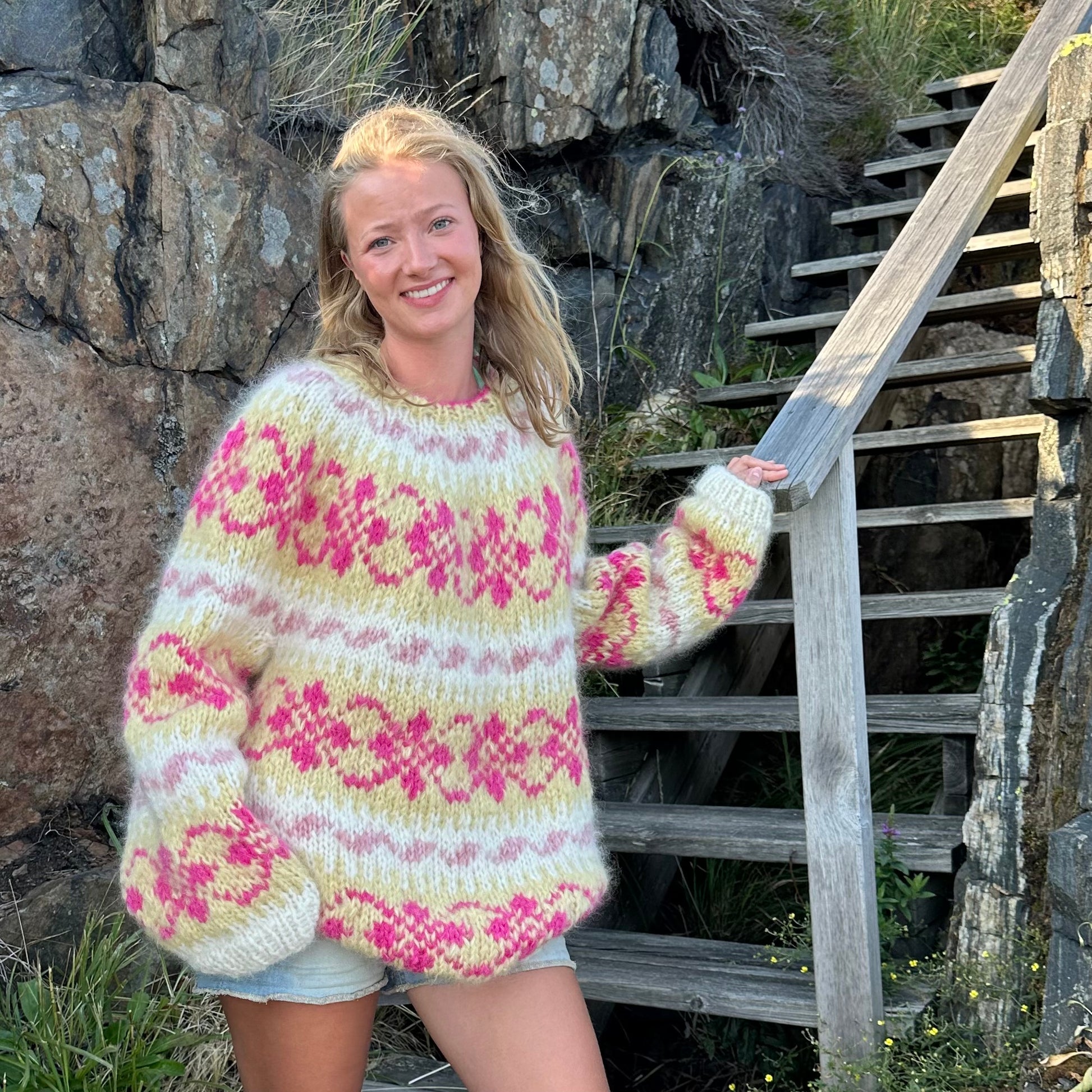 Genseren er «oversized», stor og deilig. Den strikkes nedenfra og opp med en tråd Tjukk mohair og en tråd Puno på pinner nummer 8 og 10 – og det går veldig fort.